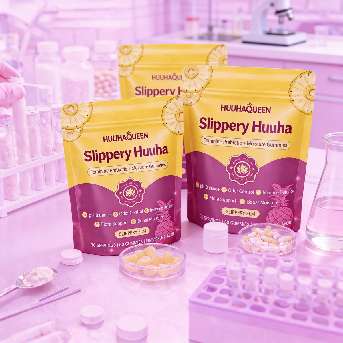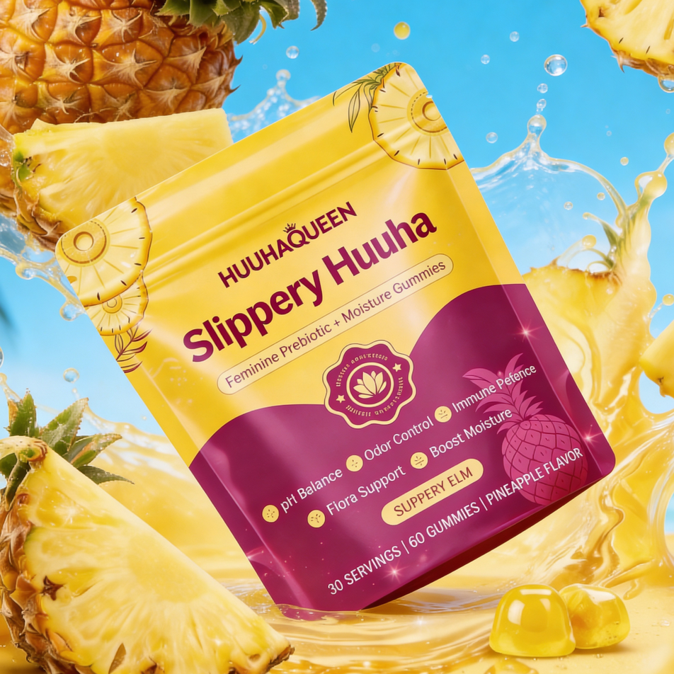 Huuha Queen uses three ingredients that work from the inside out. Slippery Elm rehydrates the tissue that produces your natural moisture. Bacillus Coagulans is a probiotic that survives stomach acid to actually reach your vaginal flora and rebalance pH. Pineapple Fruit supports freshness naturally. Two gummies a day — your body does the rest.